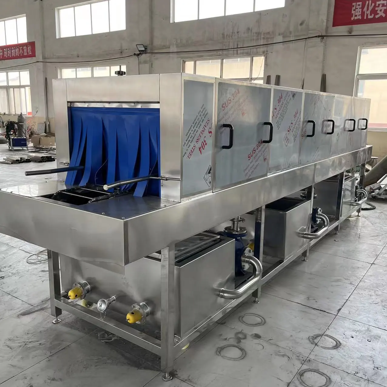 این دستگاه از اسپری پرفشار، آب داغ، مواد شوینده و شستشوی چند مرحله ای استفاده می کند. جعبه ها از طریق بخش های شستشو، آبکشی و خشک کردن اختیاری در یک سیستم نوار نقاله اتوماتیک برای تمیز کردن مداوم حرکت می کنند.